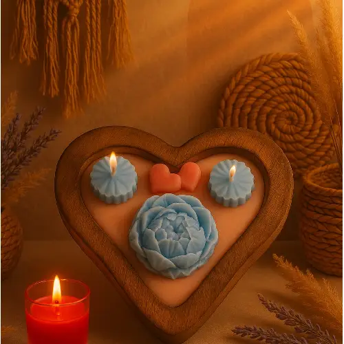Hand-poured warmth in a heart-shaped wooden embrace.3